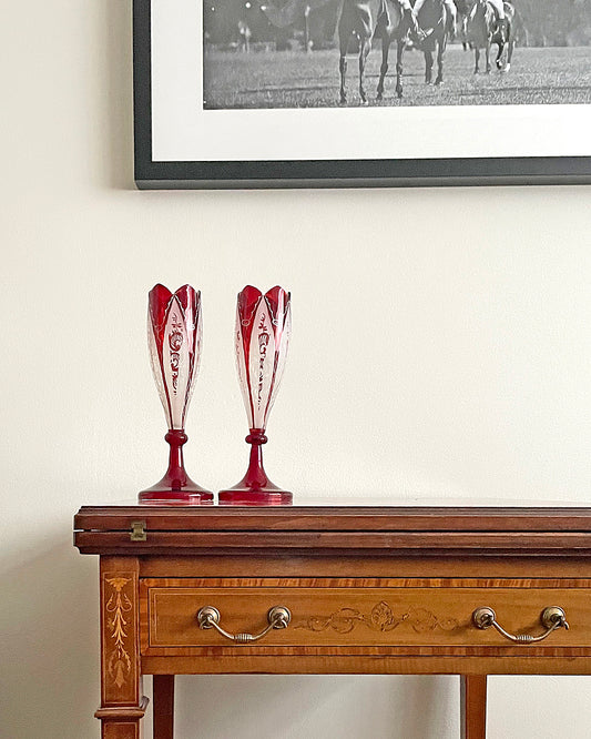 A Pair Of Bohemian Tulip Vases Burgundy & White 1880's ANTIQUE