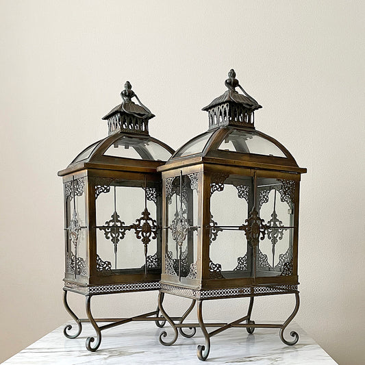A Set Of Large Lanterns Glass & Pierced Metal Indian Style VINTAGE