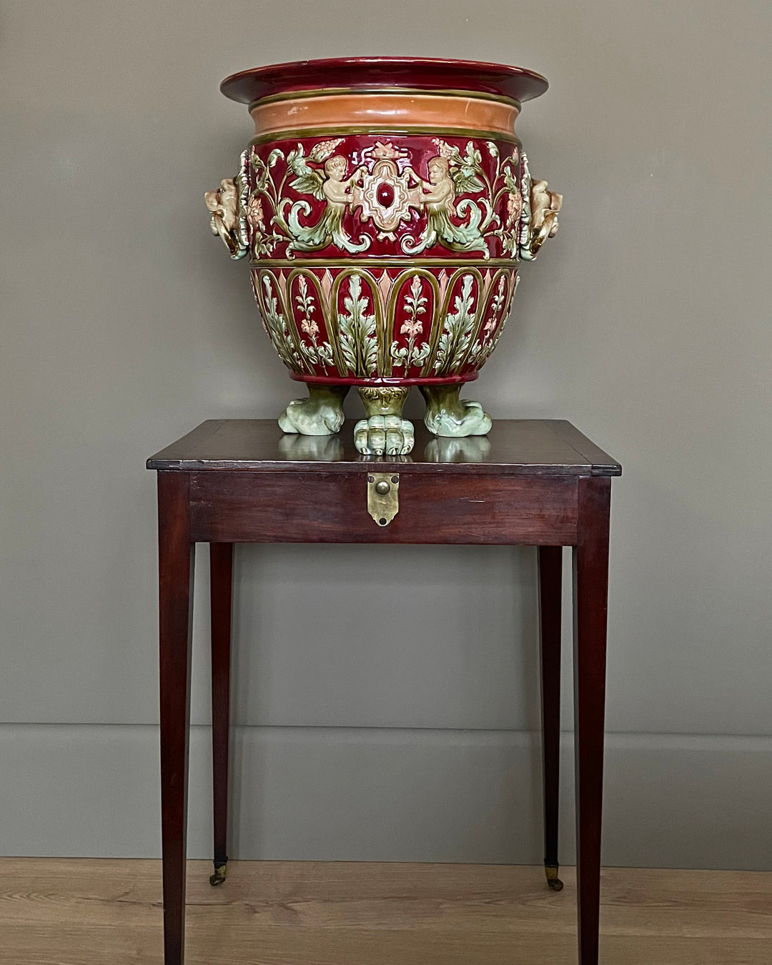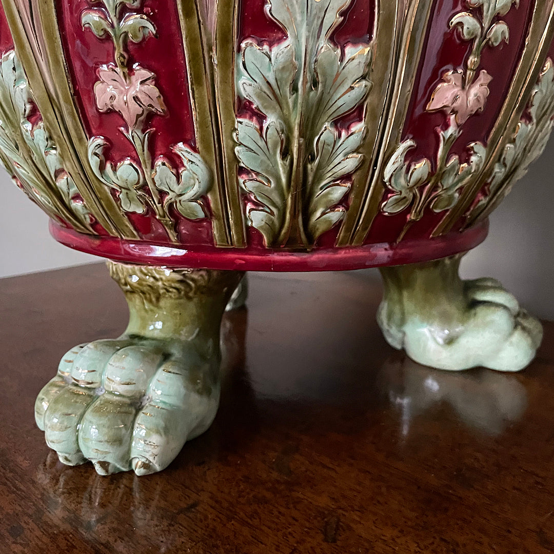 This exceptional jardeniere, or plant pot, was made around the end of the 19th century. Made by the finest craftmen, with tasteful glazing tints of burgundy and green with gilded detailing. Its exterior features elaborate decorations of flowers, acanthus leaves, cherubs and two lion mask handles. The planter pot is raised on three haired lion paws.