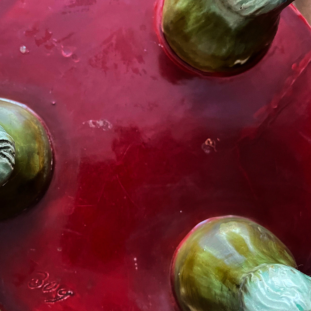 This striking piece of majolica ceramic is similar to some of the designs by the Burmantofts Pottery in Leeds. Made of English majolica, a type of earthenwear that features high relief mouldings of bold naturalistic designs with bright and vibrant glazing.