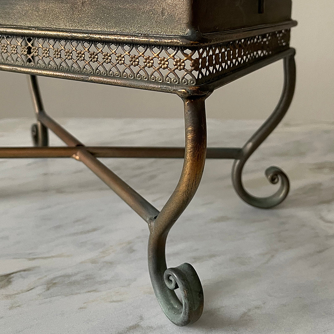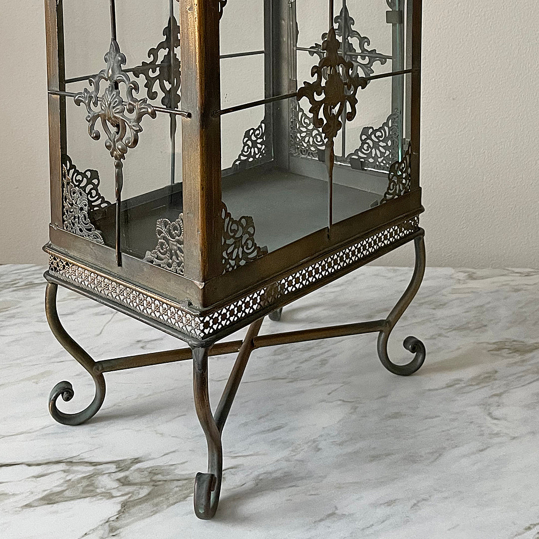 Much of the striking look of the lanterns is down to the architectural elements used in its design. The top section consists of a curved dome made up of four individual pieces of curved glass. Standing on top of the dome is another decorative section with a small roof a little reminiscent of a pagoda, that provides ventilation for the heat from the light source. The top is finished with a lovely finial and fitted handle. Both lanterns are raised on metal stands with four curved feet.