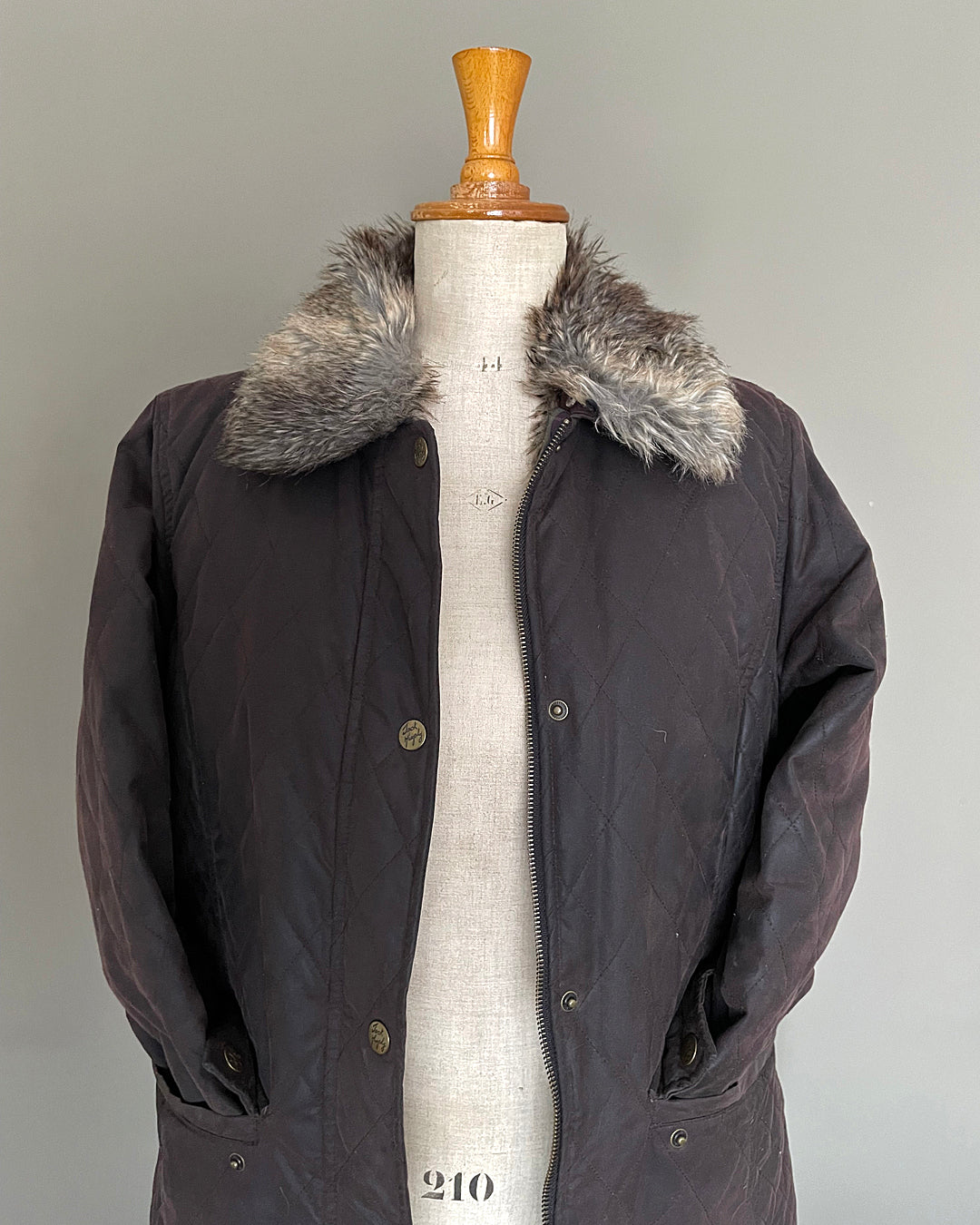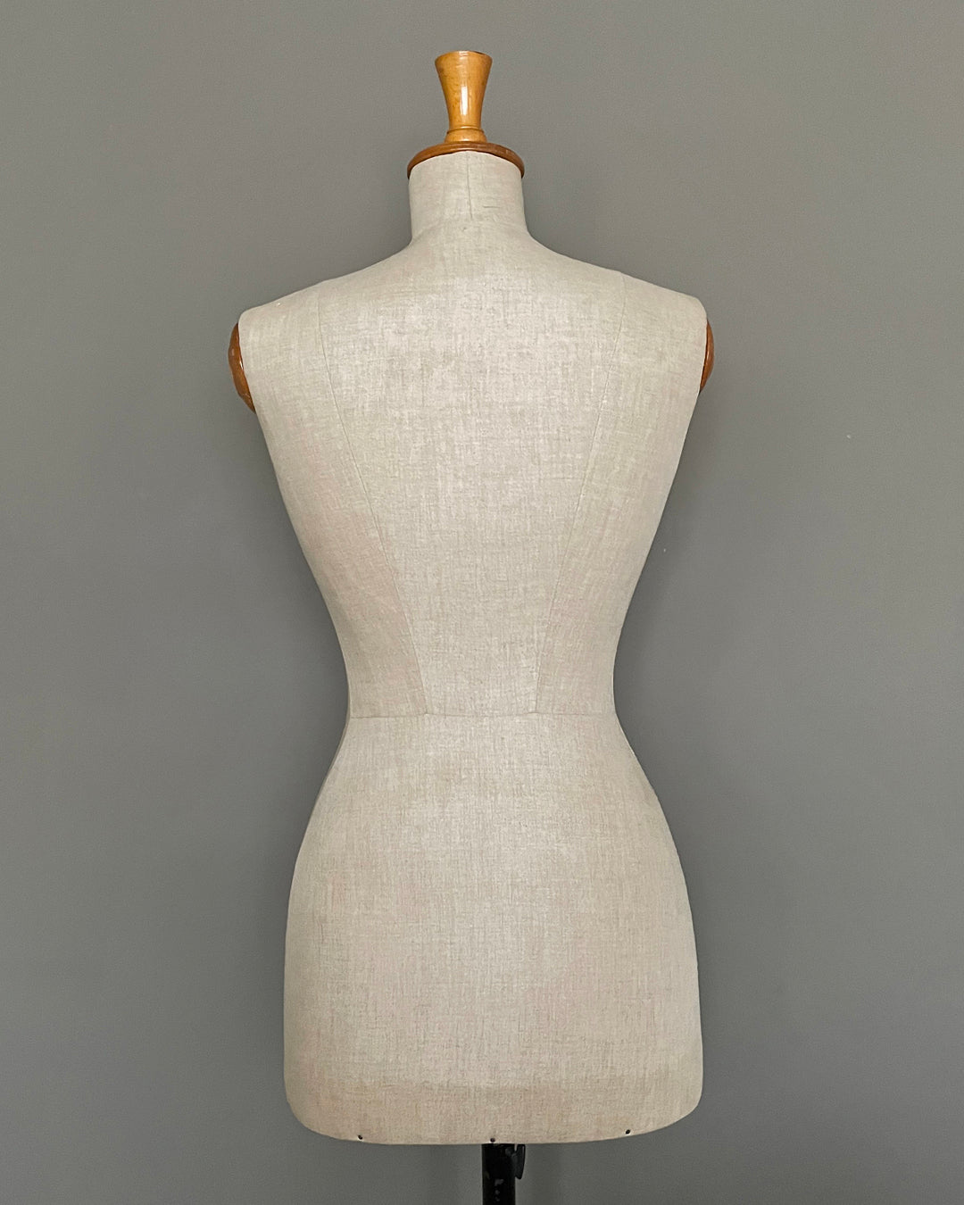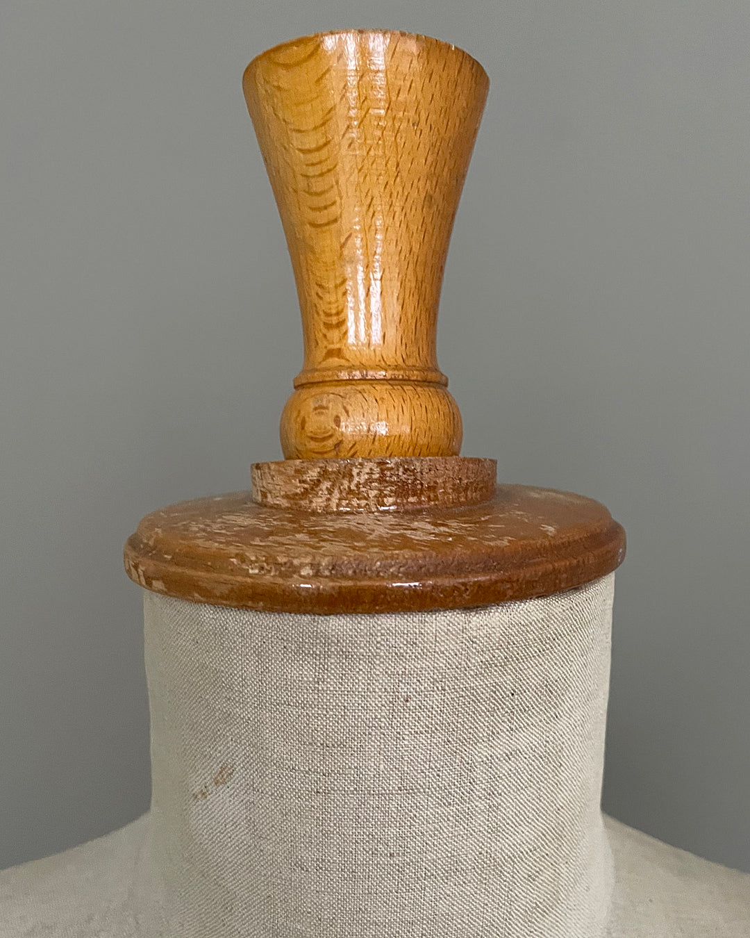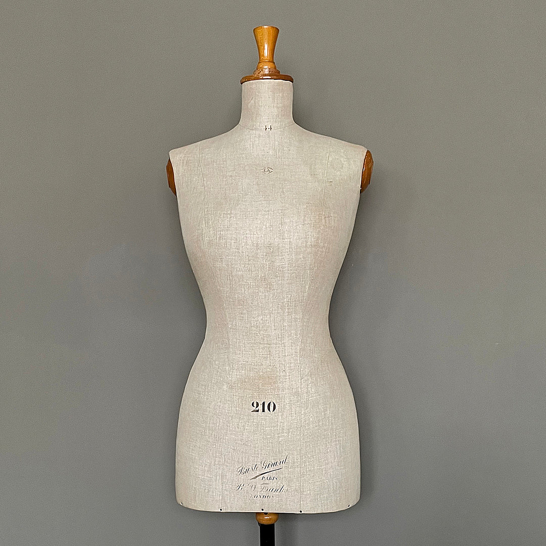 This is the Buste Girard version, number 210, made in Euro size 44 / UK 16. Still carrying its original wooden finial and arm covers in a lovely warm pine. Formed most likely from paper mache and still wearing its original covering with manufacturer, retailer and sizing stamps.