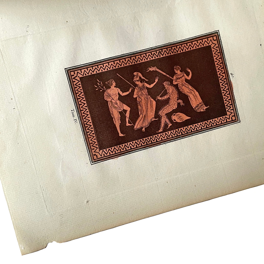 This collectable hand coloured image was printed on a page size of approximately 258mm x 185mm. Part of volume IV, this second edition was a less extravagant and expensive edition compared to the original release in folio size. The original title was Antiquités Etrusques, Grecques et Romaines, tirées du Cabinet du M. Hamilton which was published in Naples from 1766-67.