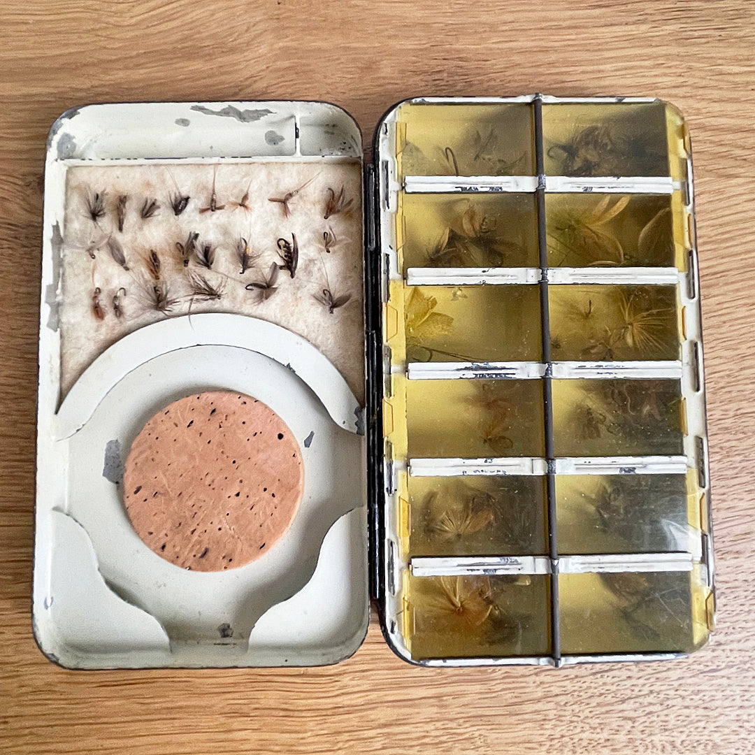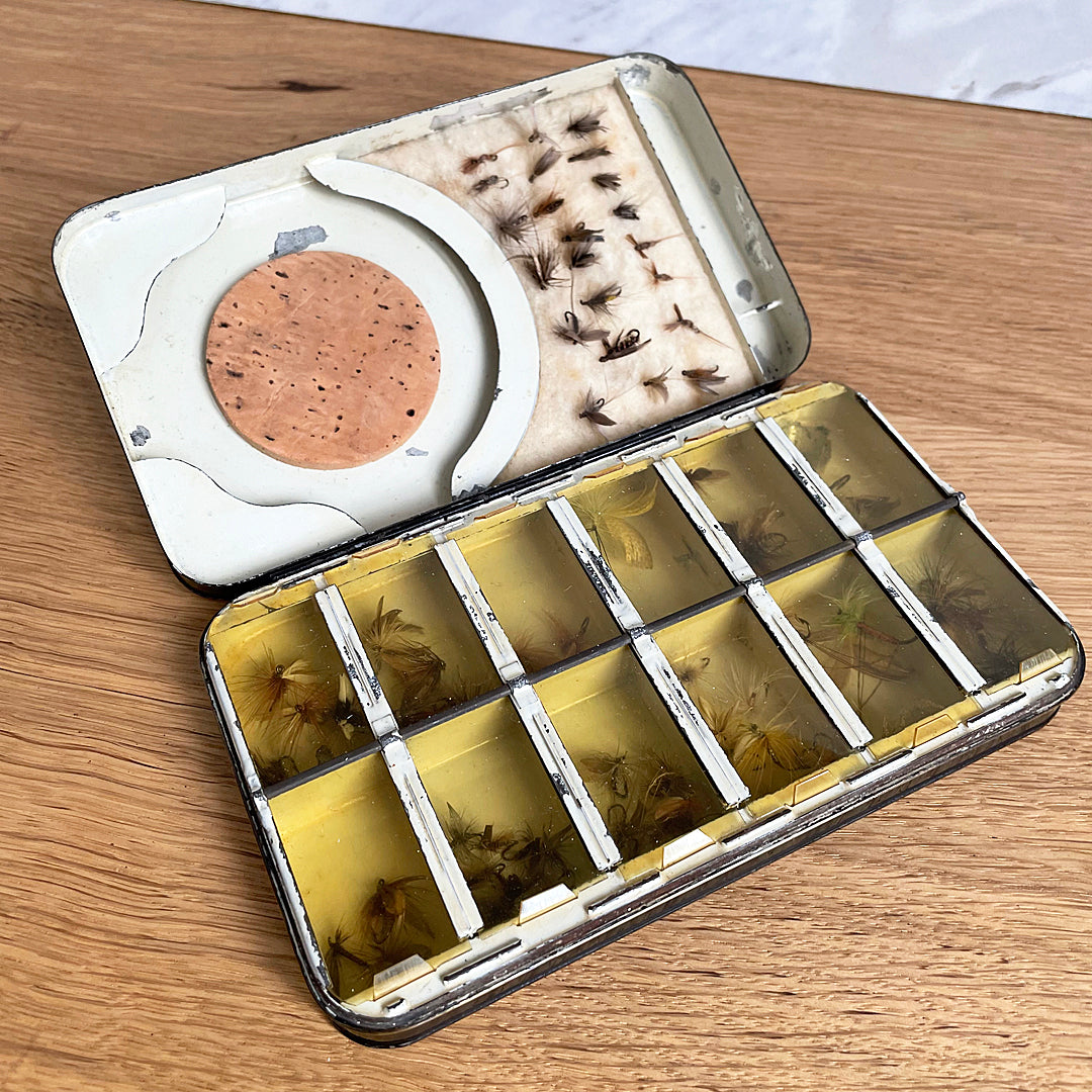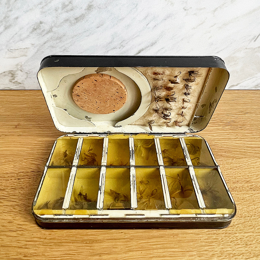 The clever design of this early dry fly box features several areas to store fishing flies. The top left of the case is fitted with cream felt that makes access to frequently used flies easy. The bottom left has a circular shaped compartment for storing fishing wire. In the centre is a small cork platform that provides fast access to favourite flies.