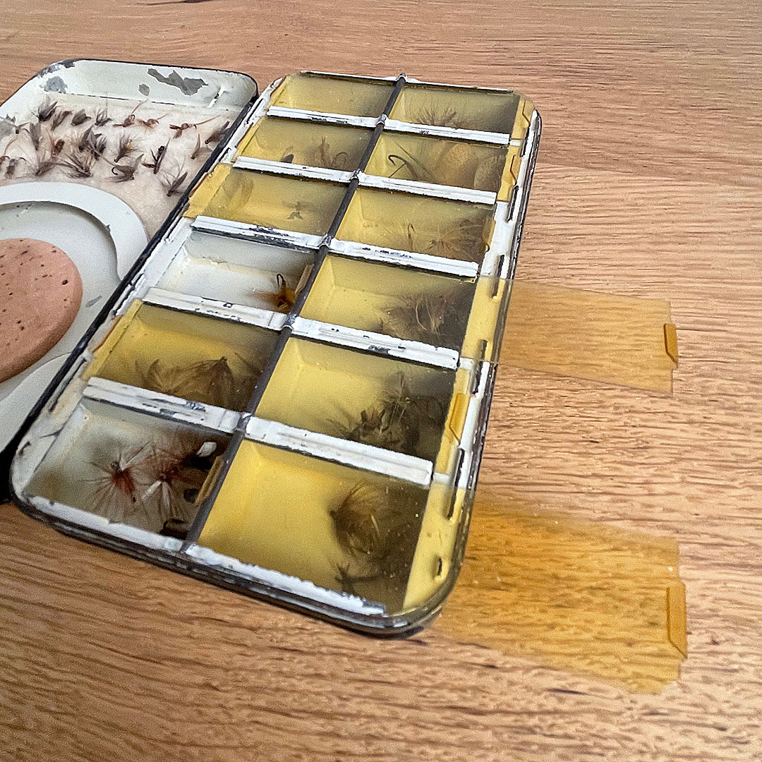 The other half of the box features two rows of six, or twelve compartments for keeping dry flies separate. All sections are lidded with six transparent sliding covers, an innovative solution. This Hardy case is supplied with a collection of period dry flies.