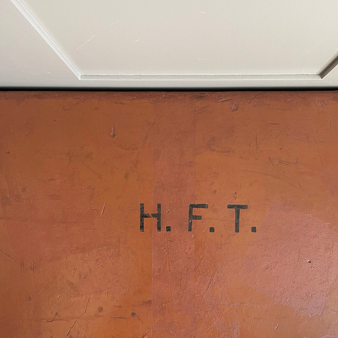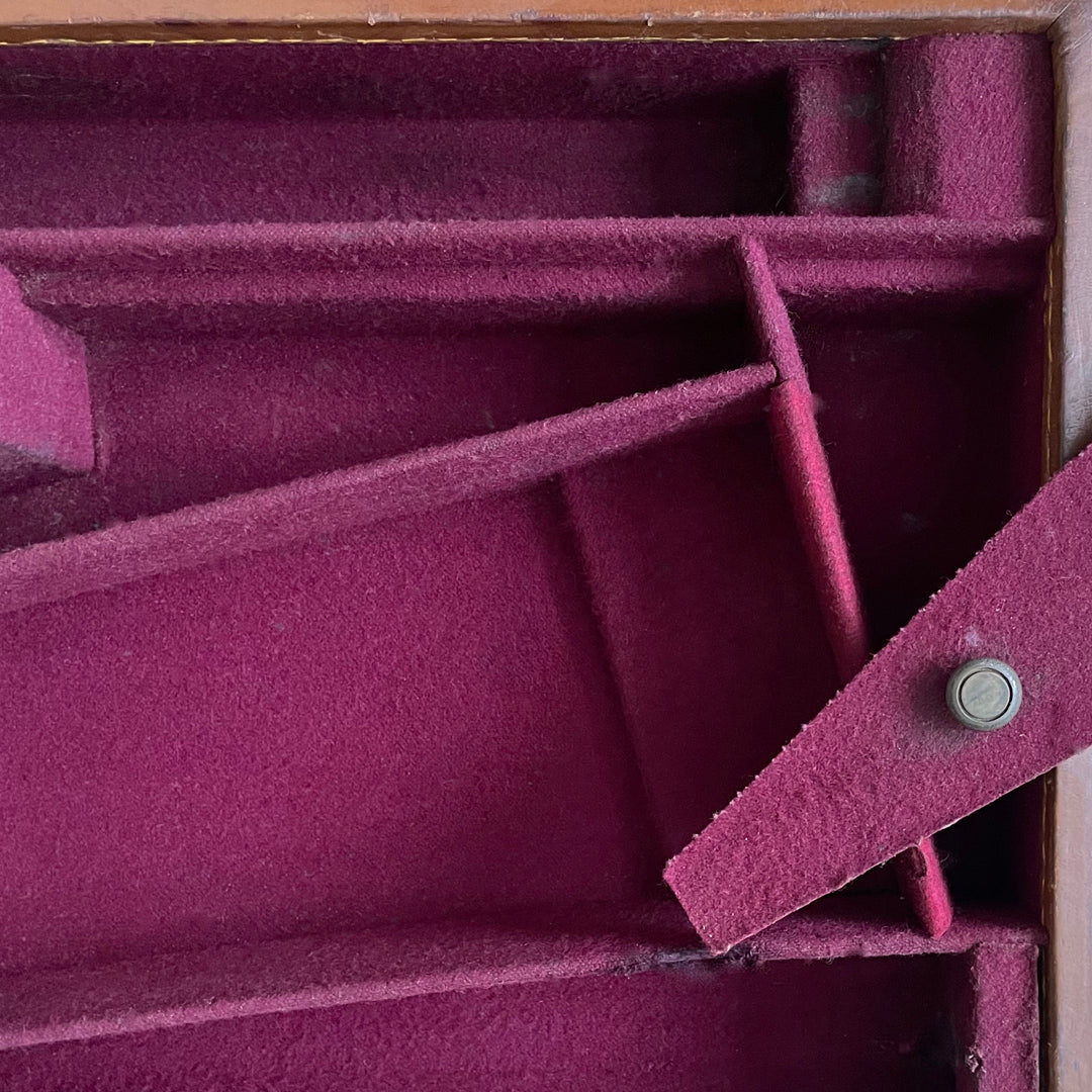 The leather carries the scratches and scars commensurate with its age. A former owner decorated the case with several stickers, which were largely removed by the time we received this piece. The outlines are still visible in the leather, which has created a look all of its own. The case came to us with replacement leather straps and a carrying handle that were fitted a number of years ago.