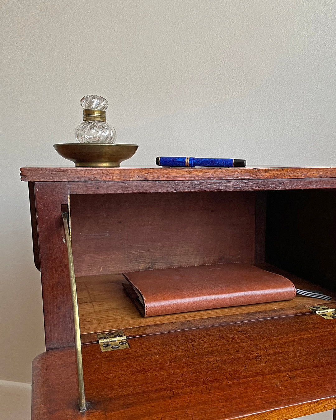 But there is more to say about this extraordinary object. The ink bottle is fixed directly onto a lovely ceramic dish. This somewhat unusual, but not a completely uncommon design, might well have been made with a person in mind that was prone to knocking his or her's inkwell over. Secondly, it is also practical as the dish can provide a space for resting one's writing implement.