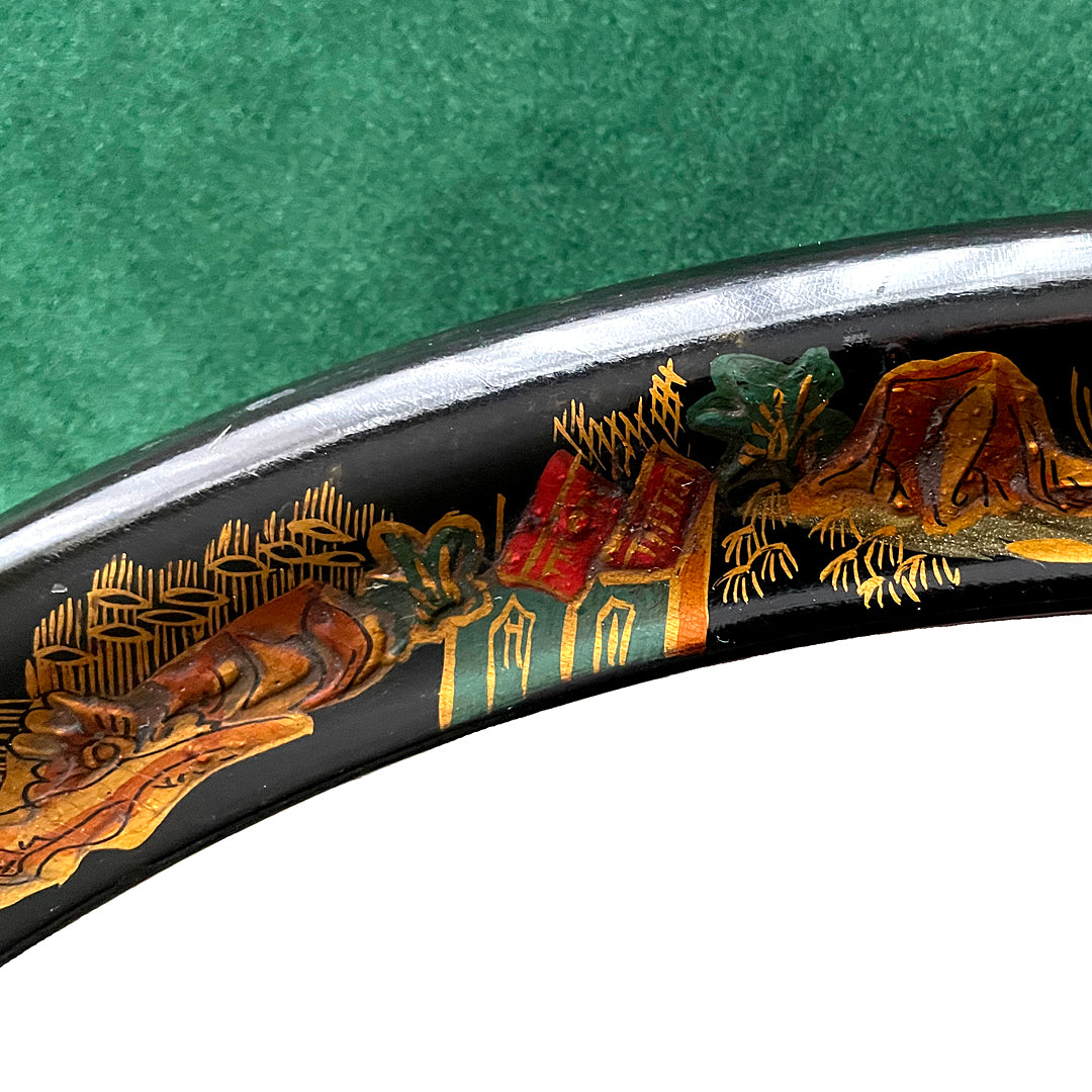 Oval Chinoiserie Mirror Japanned Black & Gold Finish Chinese Scenes ANTIQUE