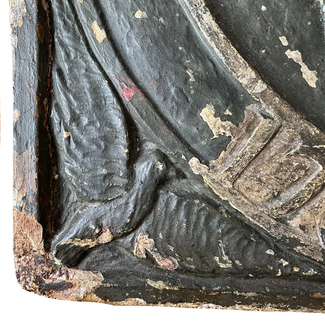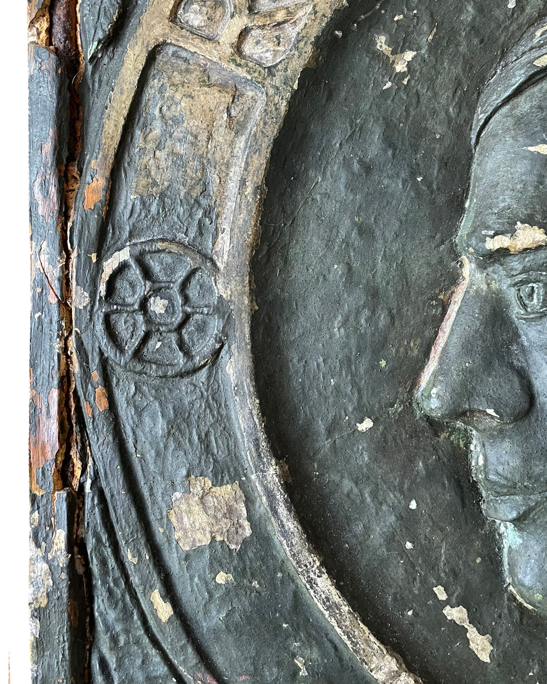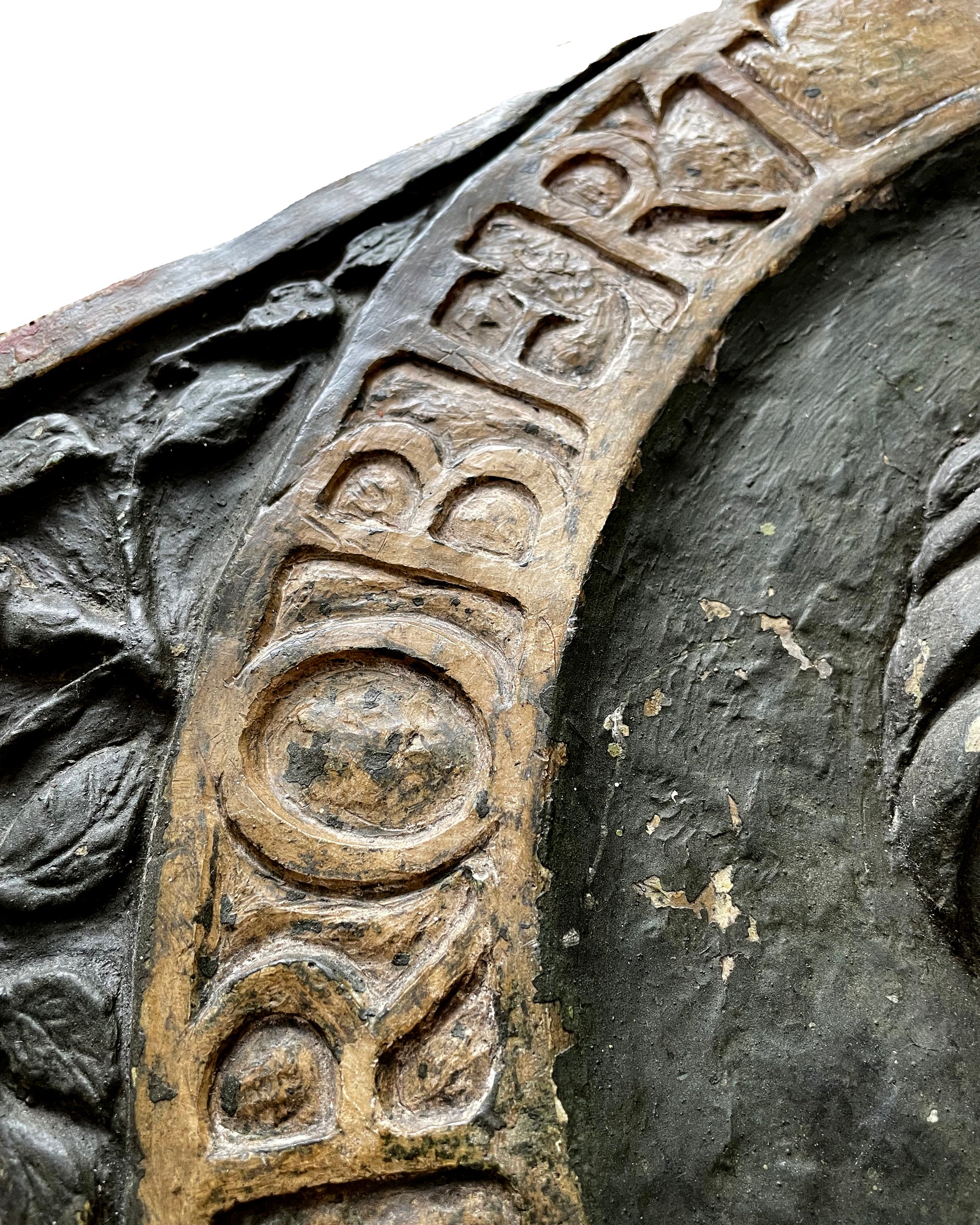 This unique piece was constructed from hand carved oak and plaster. A wooden frame, now heavily worn, surrounds all four edges. The plaster back shows some damage and old repairs. In later years the plaque was painted in a brown colour, a process called bronzing. A lot of this paint has worn off, showing through parts of the oak surface, resulting in the super attractive look. Our blacksmith has re-attached the original chain links and this decorative plaque is now ready for display.