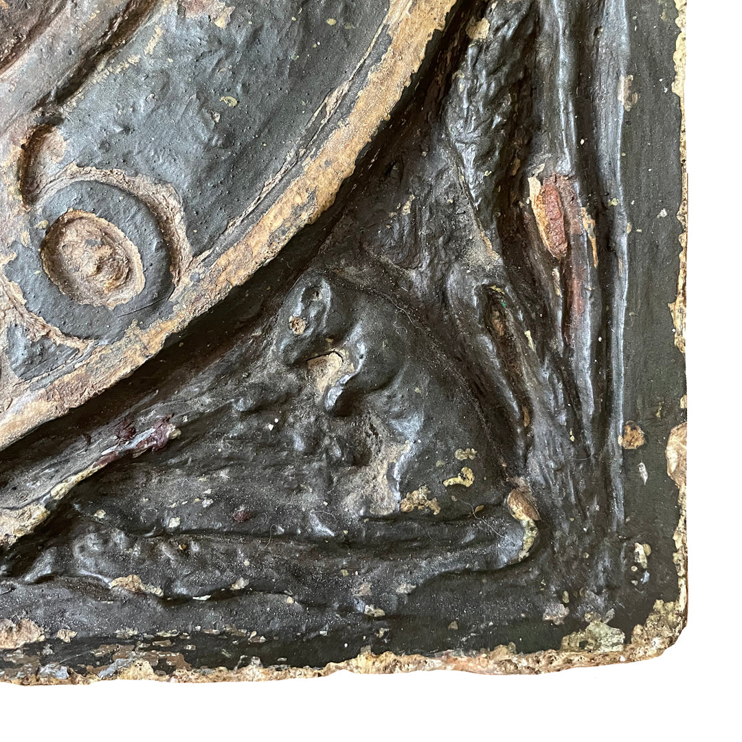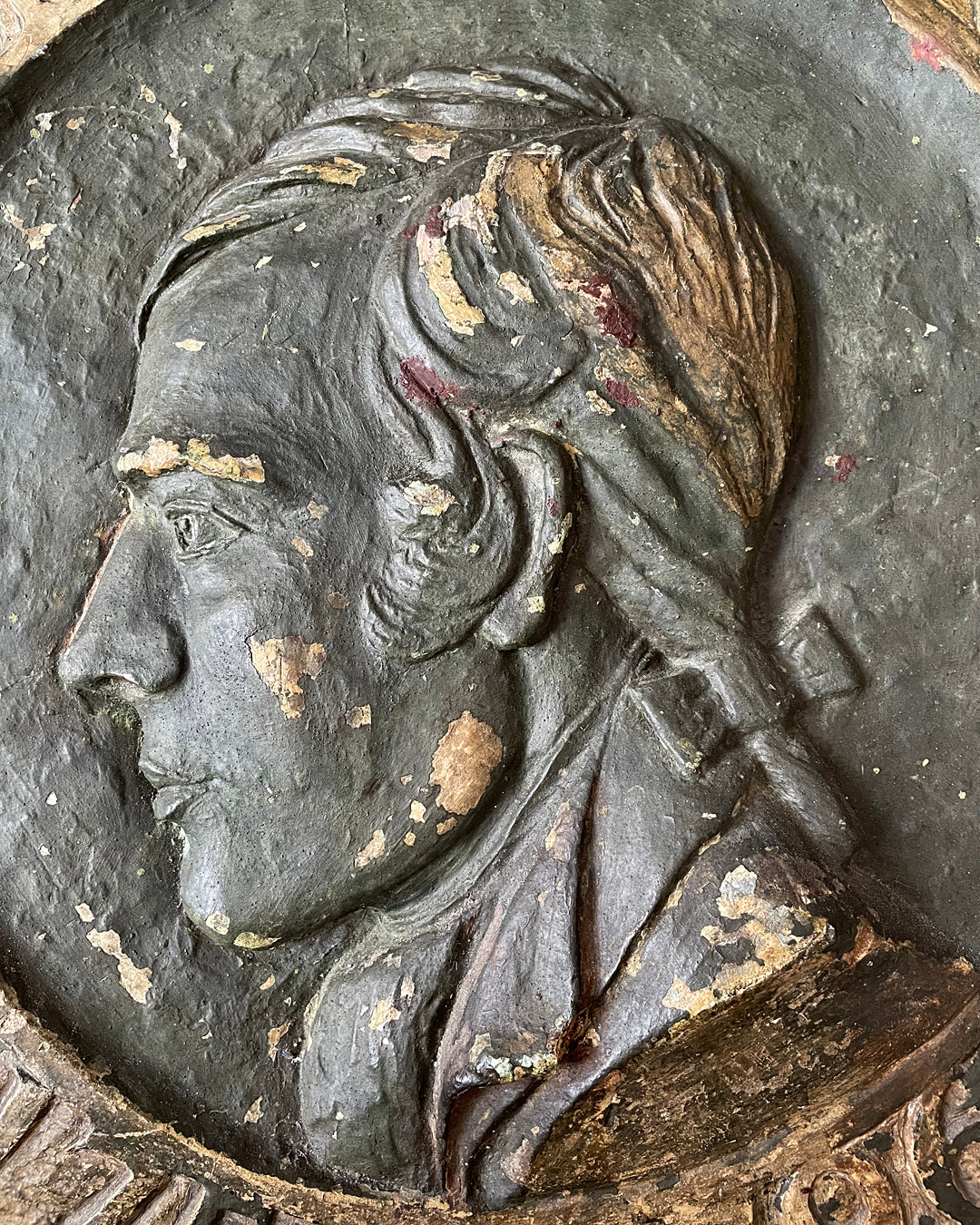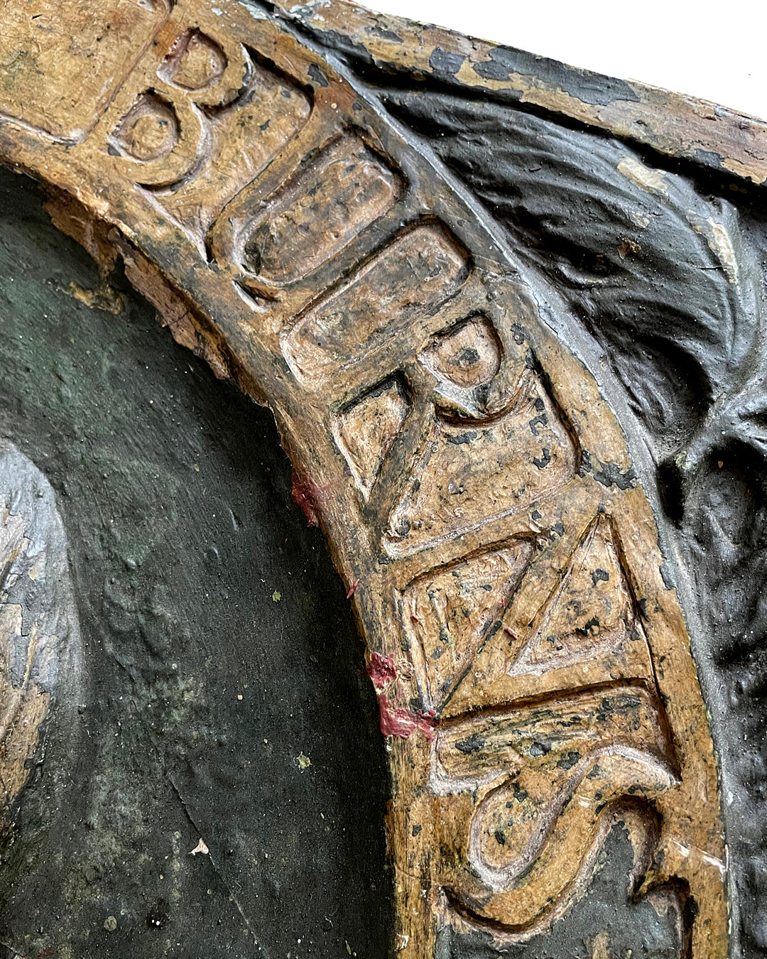 Heavily worn wood & plaster plaque bearing a rare side profile of Scotland's most revered bard, Robert Burns (1759-1796). Affectionally known as Rabbie Burns, he rose from humble beginnings to become a national poet and lyricist that captured in his works the Scottish culture and identity.
