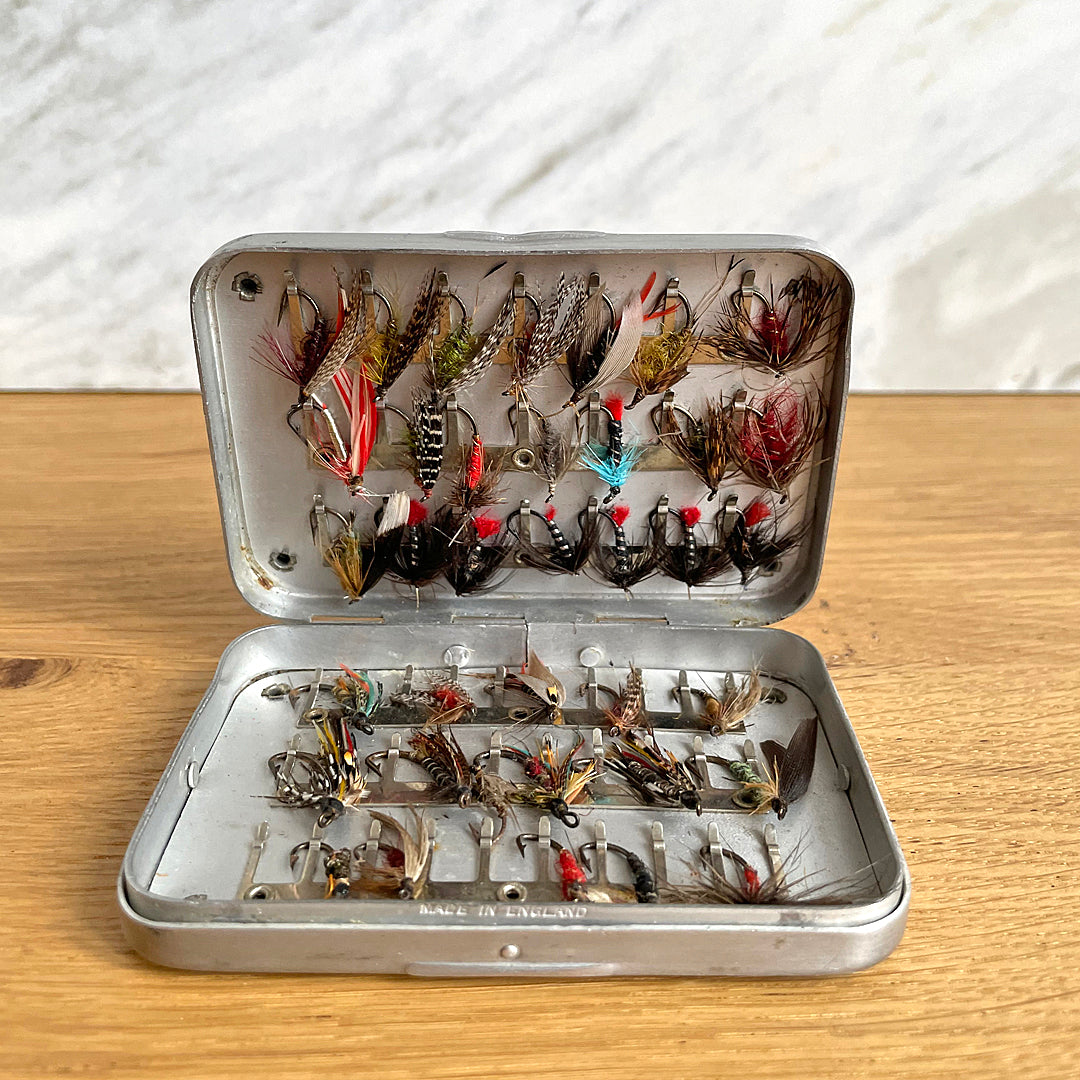 Wheatley Fly Fishing Box & Flies Aluminium 3.5 x 2.5" 1960's VINTAGE